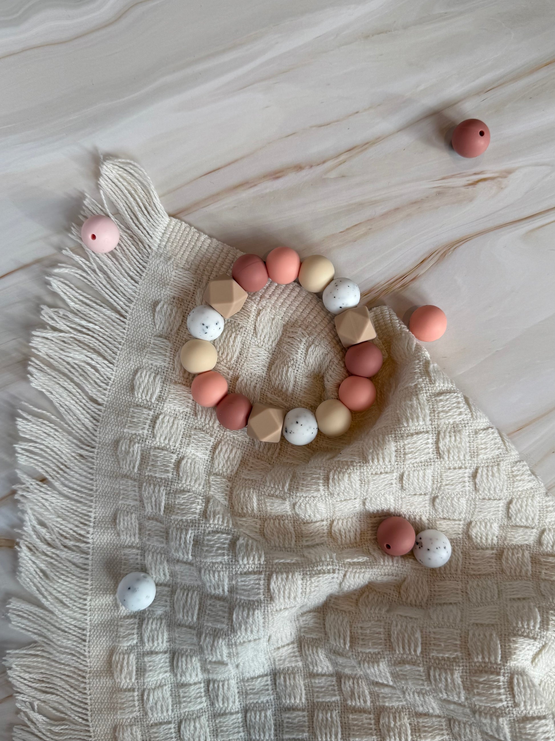 Gi babyen din en trygg og lindrende opplevelse med vår håndlagde bitering laget av BPA-frie silikonkuler og solid nylontråd. Perfekt for små babyhender, og ideell i den krevende tannfrembruddsperioden.