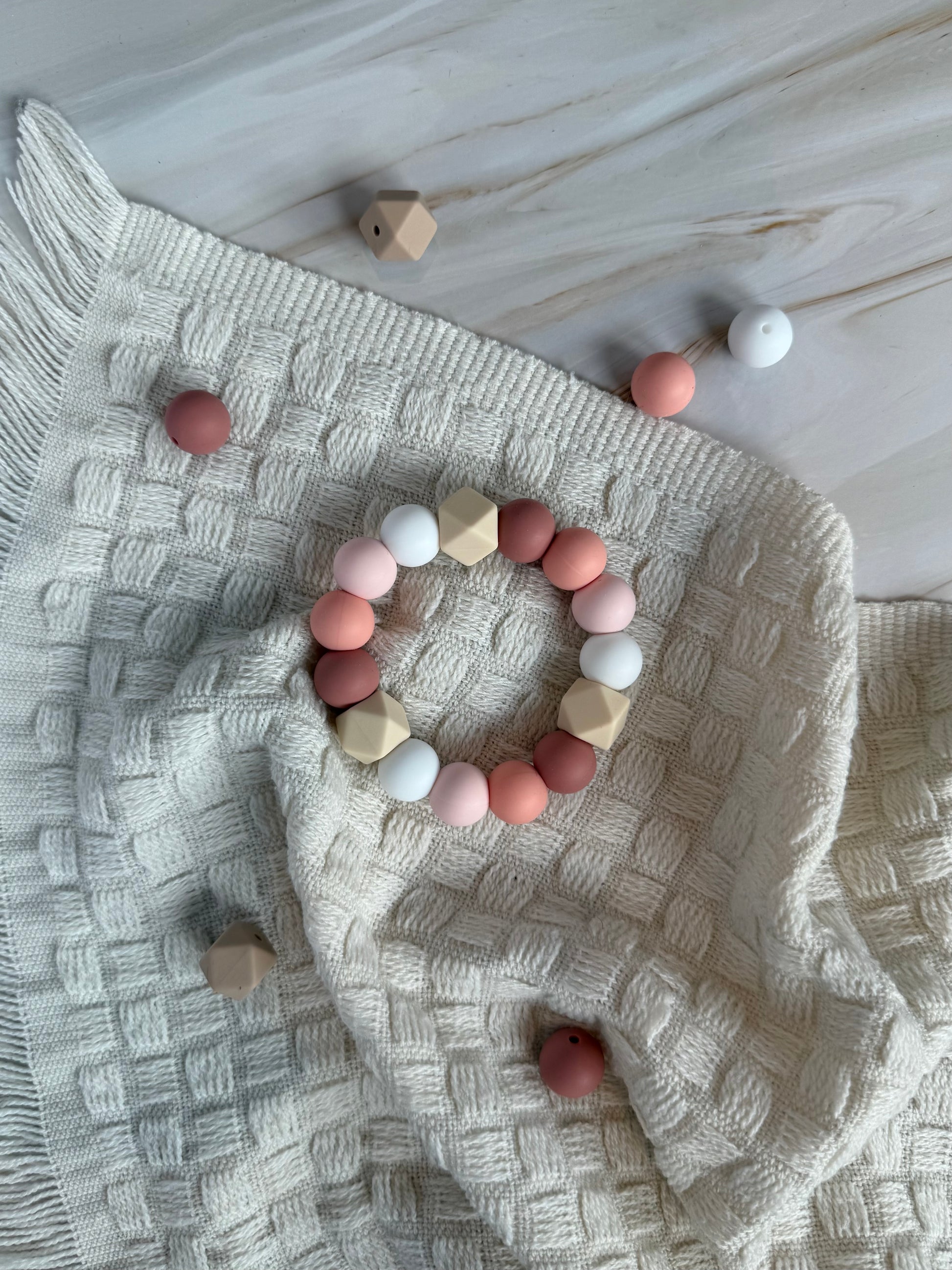 Bitering laget med 100% giftfrie og BPA-frie silikonperler. 15mm rundperler og 14mm heksagonperler. Perlene er kjøpt hos minlillehobby.no. Perlene er testet både fysisk og mekanisk på et akkreditert laboratorium, og er bitesikre.
