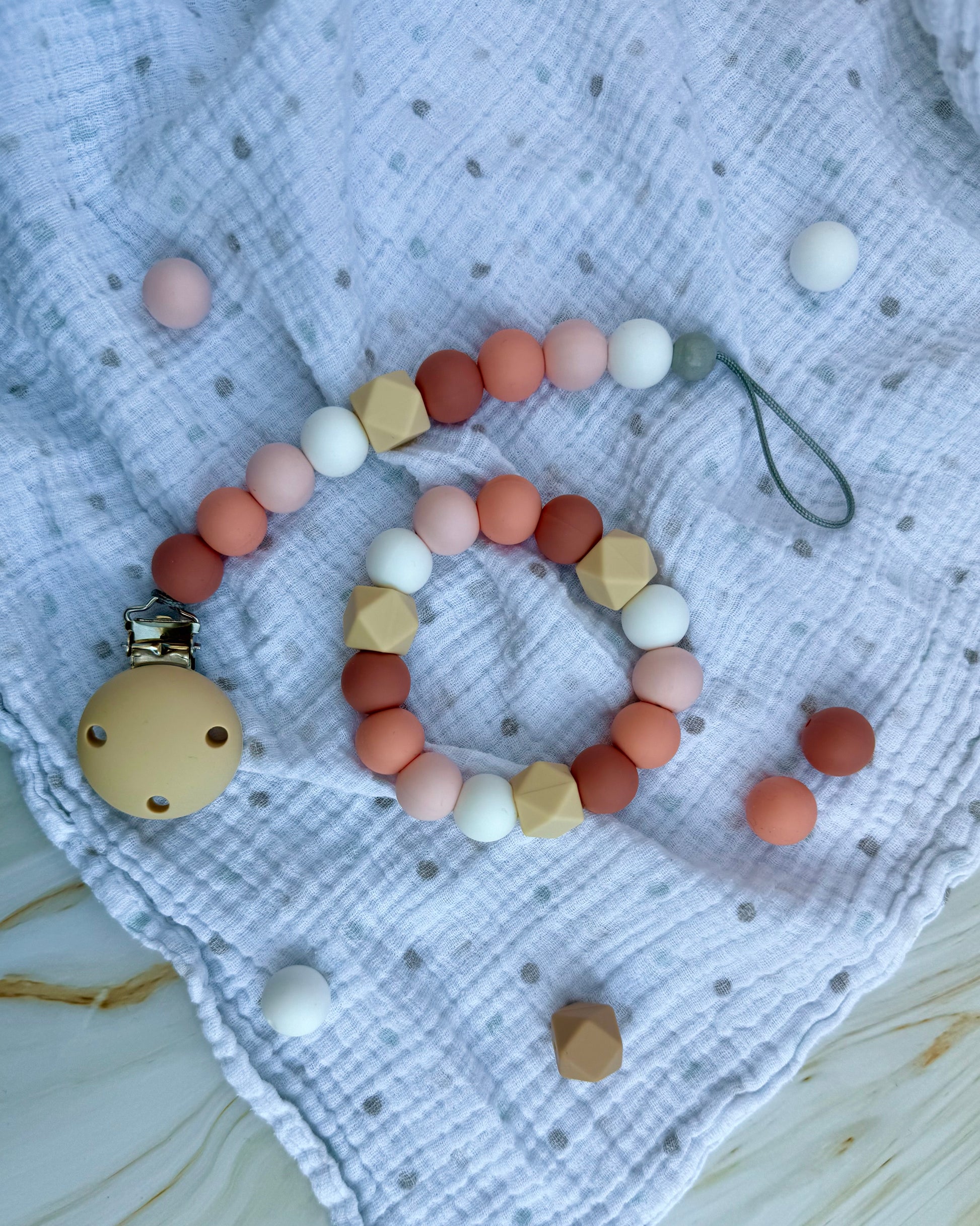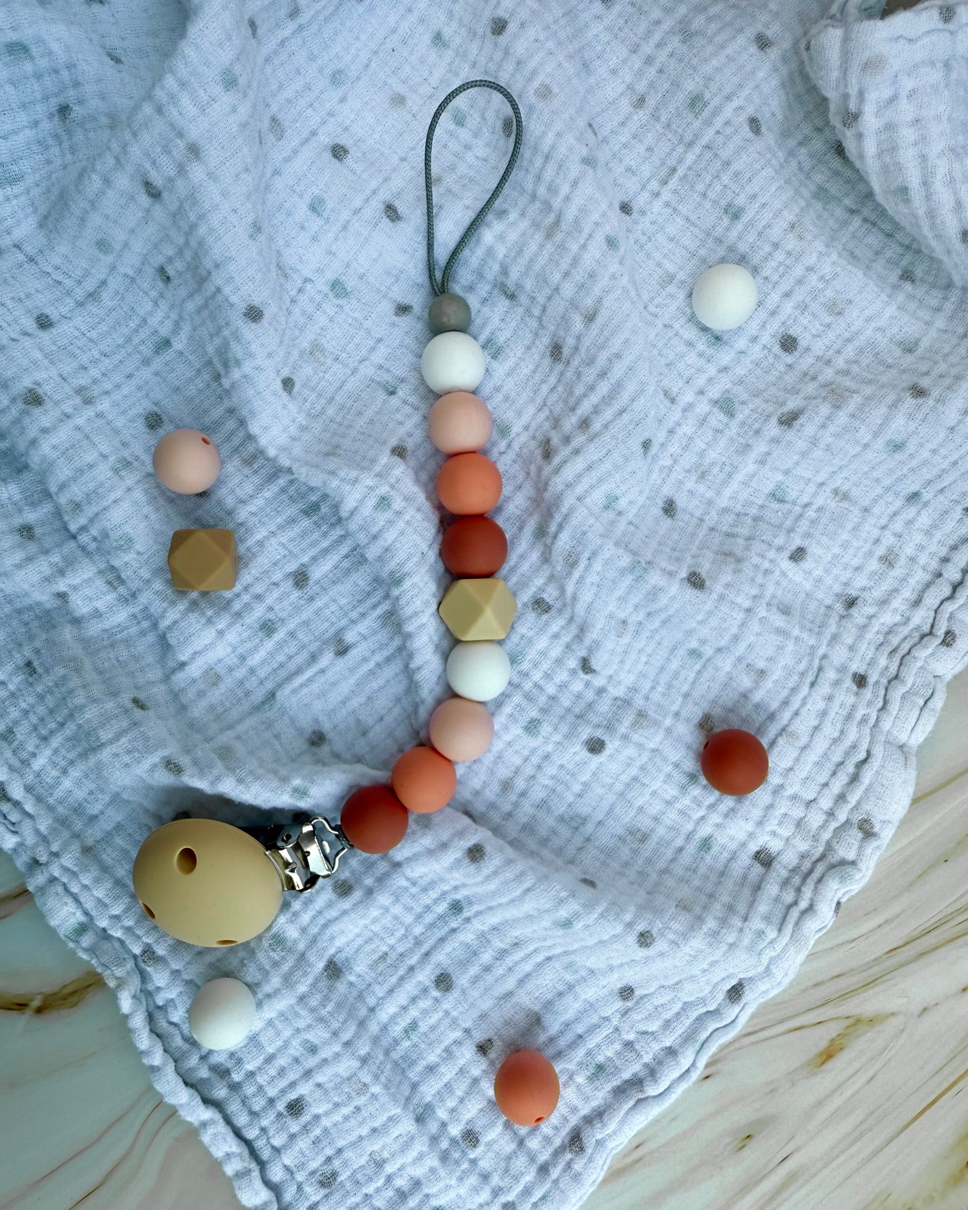 Hold smokken eller siteringen innen rekkevidde med denne håndlagde smokkelenken. Laget med BPA-frie silikonperler og slitesterk nylontråd. En trygg og praktisk løsning som hindrer at smokken faller på gulvet.