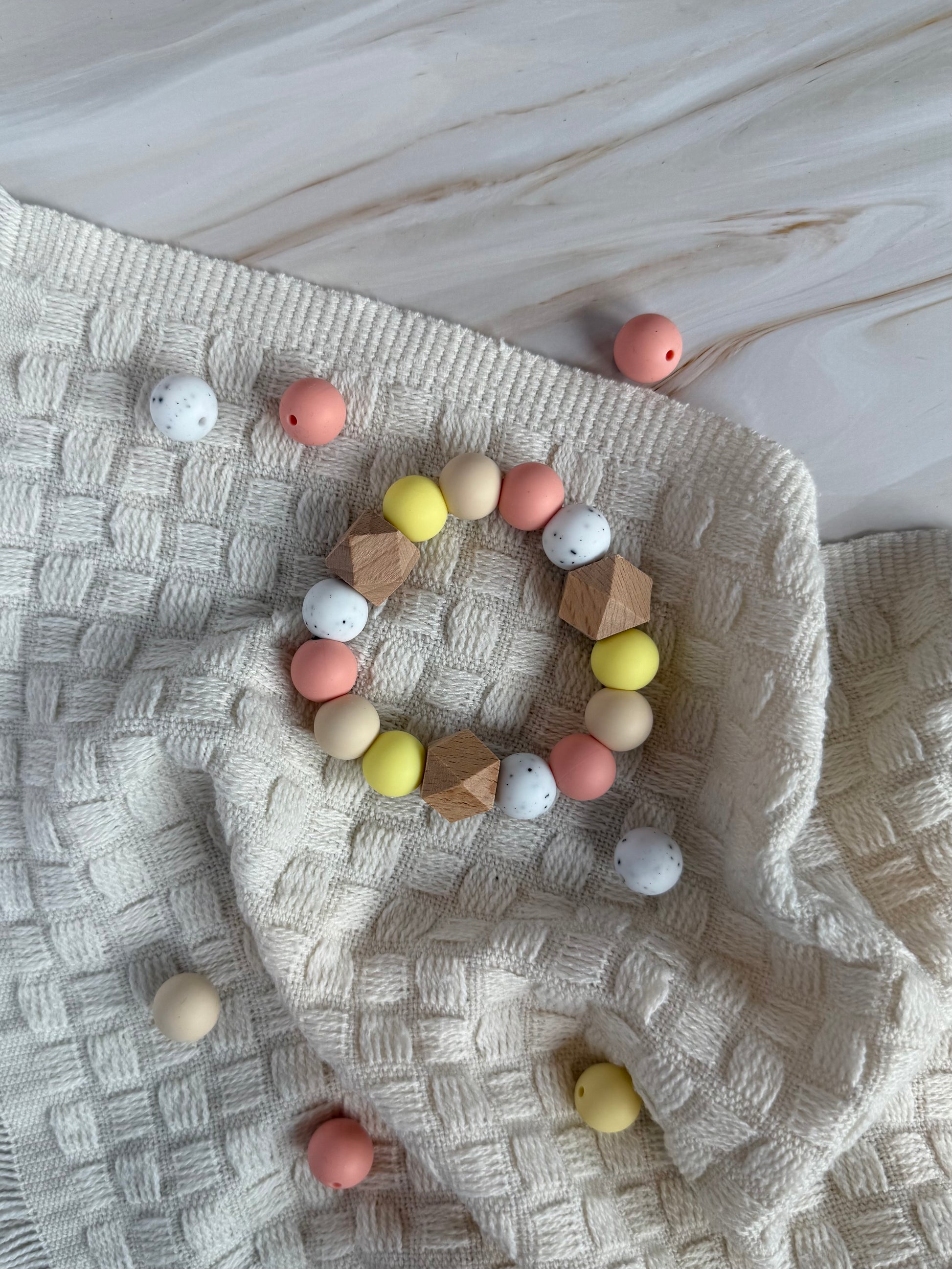 Gi babyen din en trygg og lindrende opplevelse med vår håndlagde bitering laget av BPA-frie silikonkuler og solid nylontråd. Perfekt for små babyhender, og ideell i den krevende tannfrembruddsperioden.
