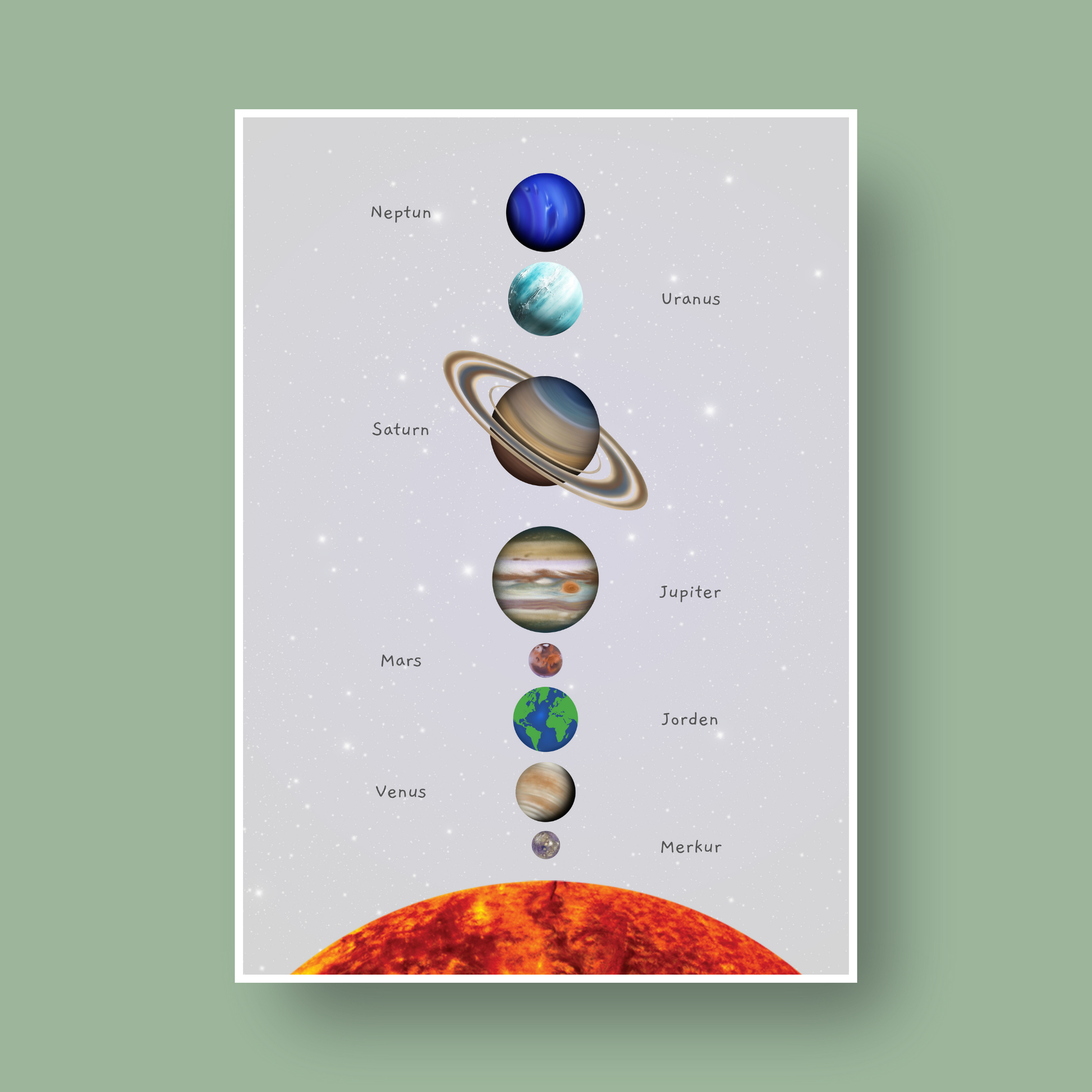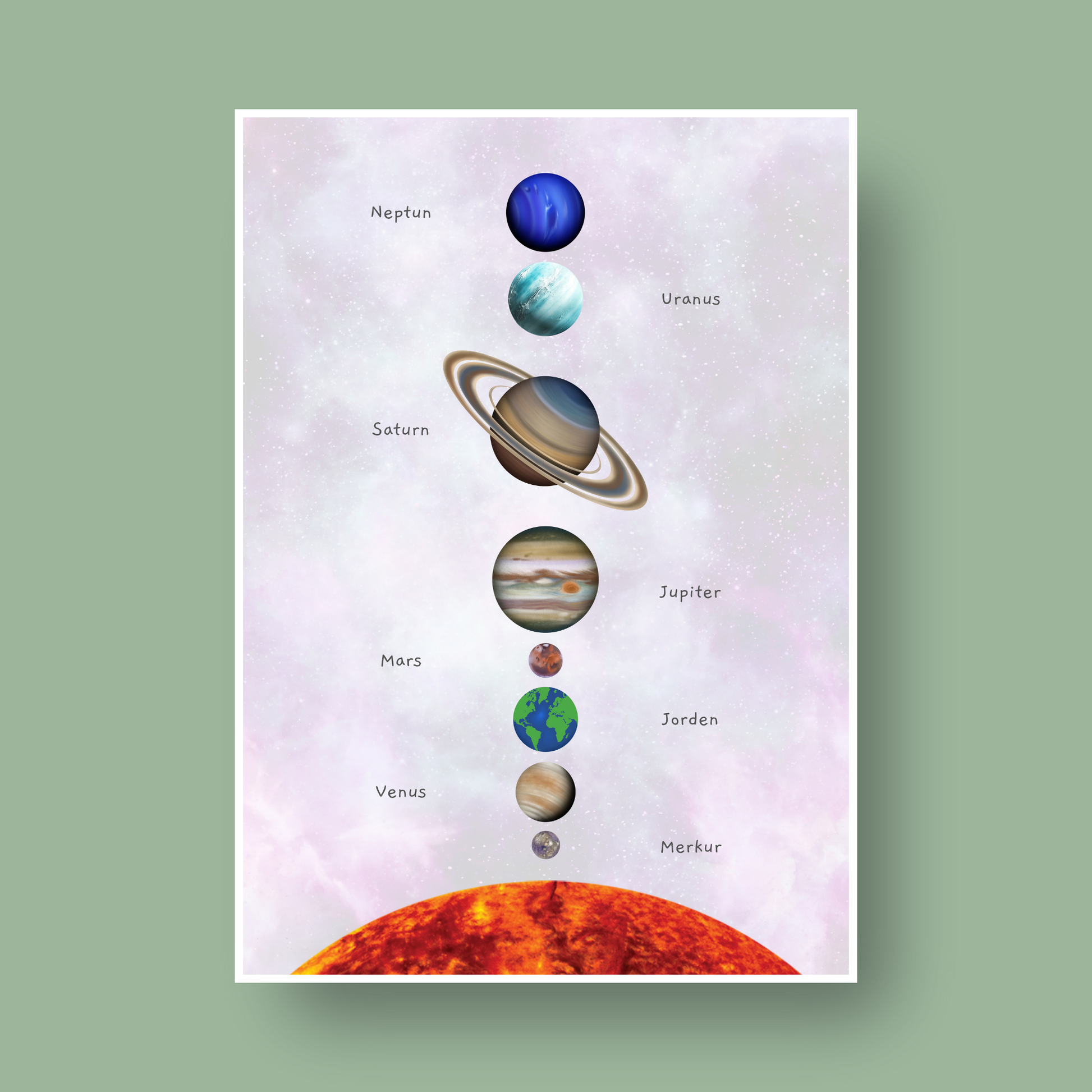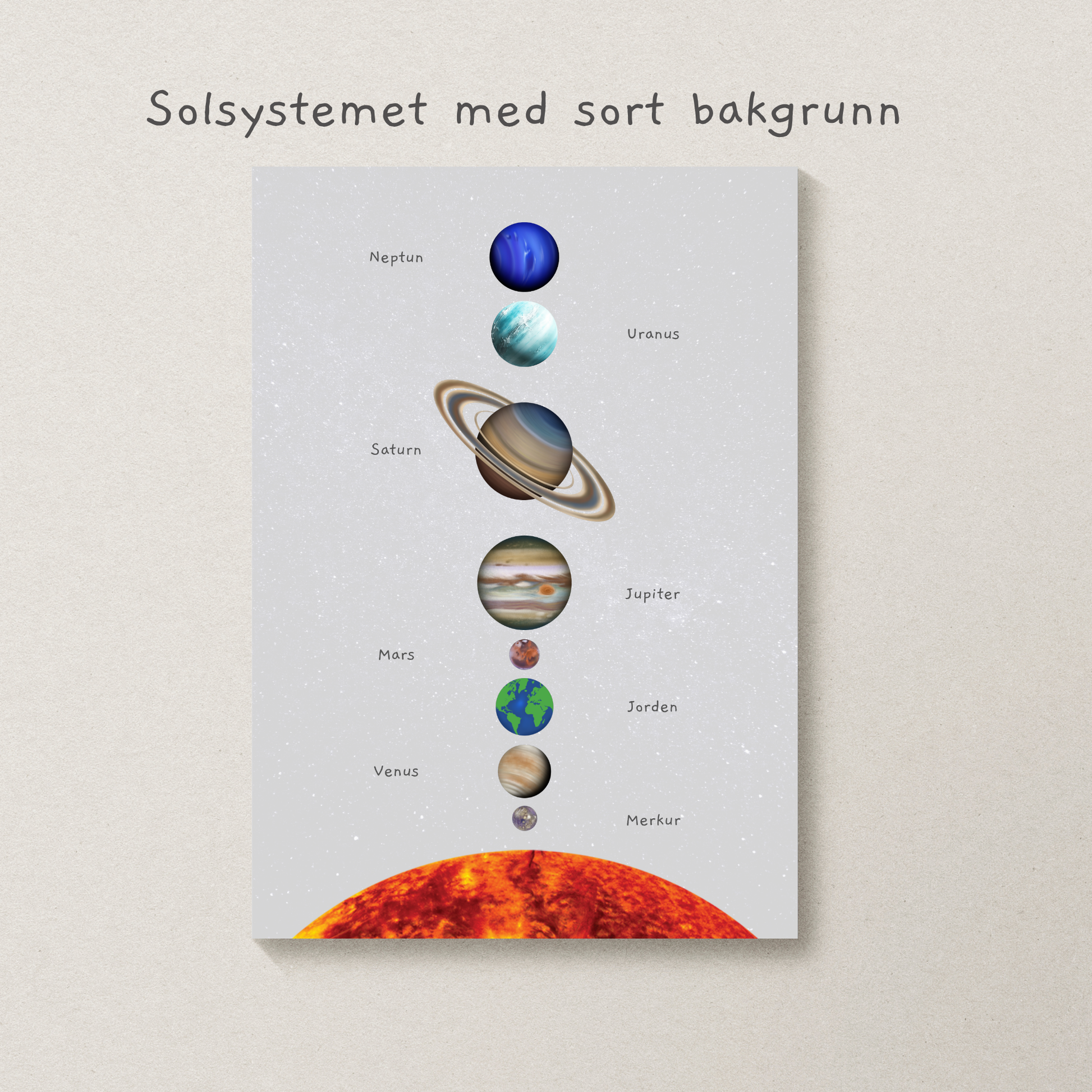 Oppdag universet med denne vakre plakaten over solsystemet! Perfekt for barnerom, lekerom eller klasserom. Plakaten kombinerer lekre illustrasjoner med pedagogisk innhold. Lær barna om planeter, rekkefølge og navnene i solsystemet på en enkel og visuell måte. Designet for å inspirere nysgjerrighet og lærelyst.