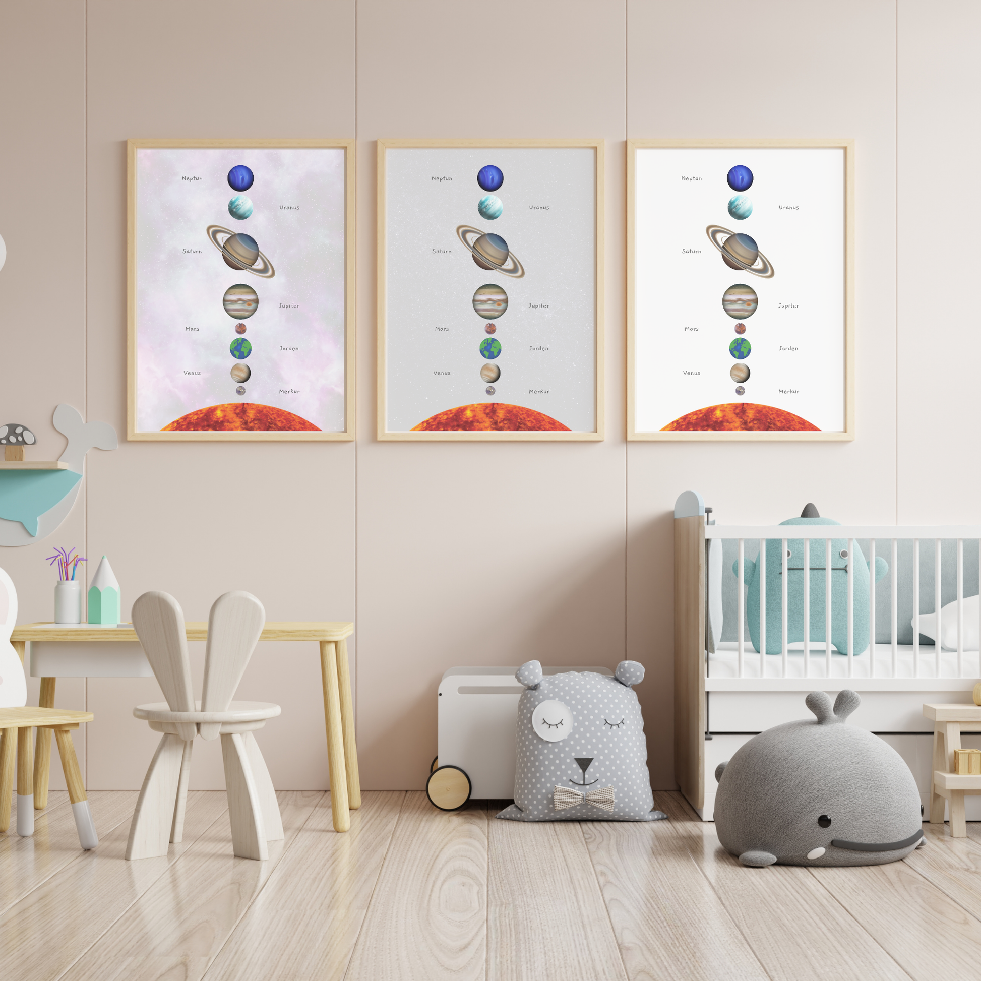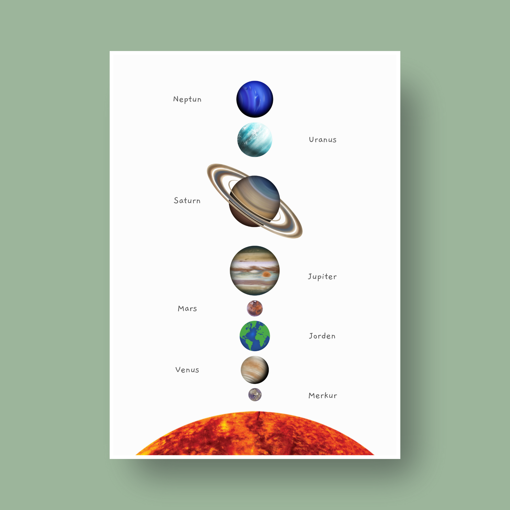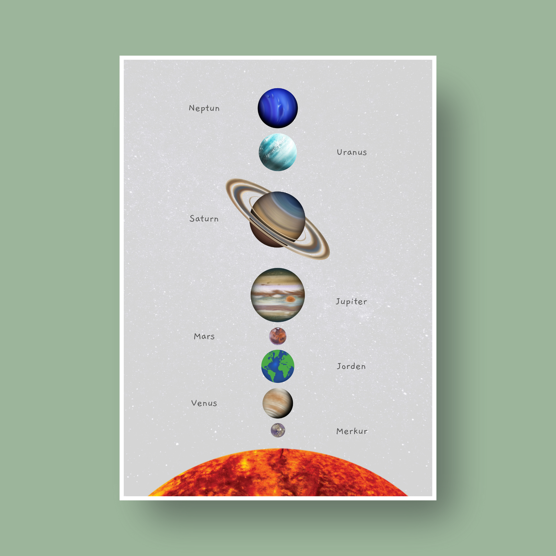Oppdag universet med denne vakre plakaten over solsystemet! Perfekt for barnerom, lekerom eller klasserom. Plakaten kombinerer lekre illustrasjoner med pedagogisk innhold. Lær barna om planeter, rekkefølge og navnene i solsystemet på en enkel og visuell måte. Designet for å inspirere nysgjerrighet og lærelyst.