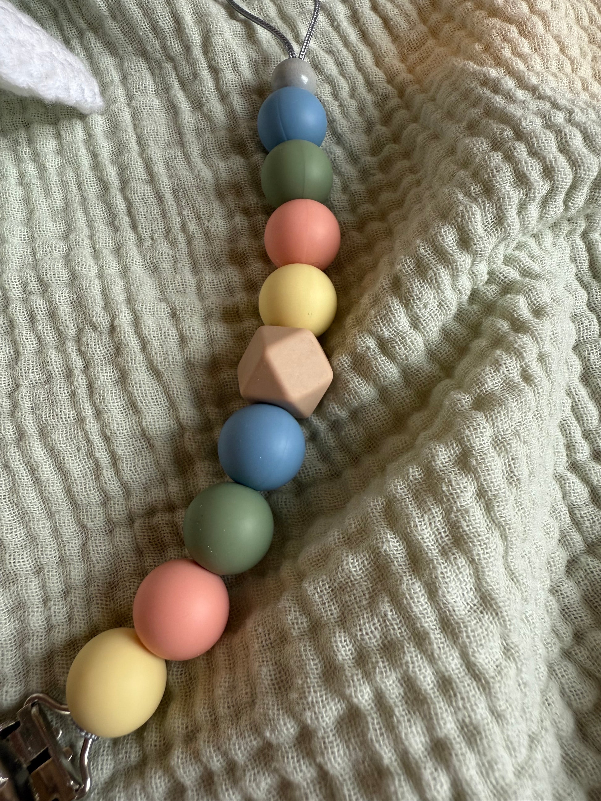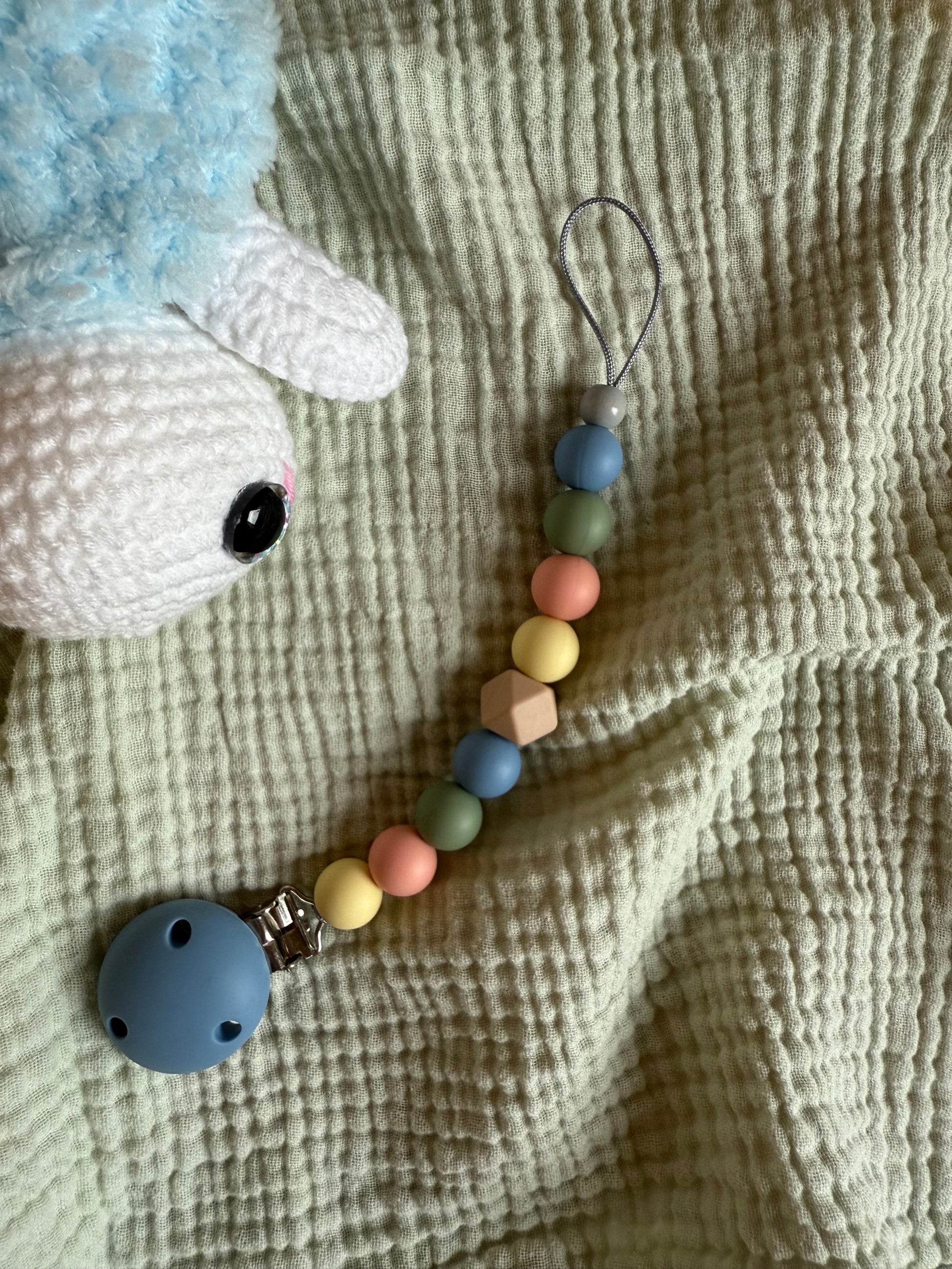 Hold smokken eller siteringen innen rekkevidde med denne håndlagde smokkelenken. Laget med BPA-frie silikonperler og slitesterk nylontråd. En trygg og praktisk løsning som hindrer at smokken faller på gulvet.