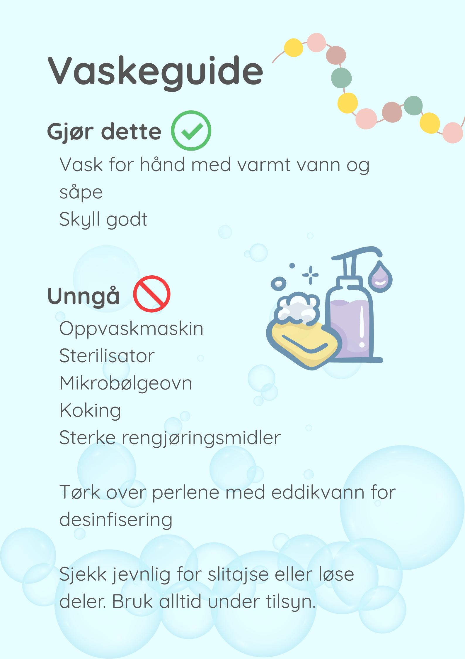 Smokkelenke laget med 100% giftfrie og BPA-frie silikonperler. 15mm rundperler og 14mm heksagonperler. Perlene er kjøpt hos minlillehobby.no. Perlene er testet både fysisk og mekanisk på et akkreditert laboratorium, og er bitesikre. Smokkelenken er godkjent i forhold til EUs sikkerhetsregler.