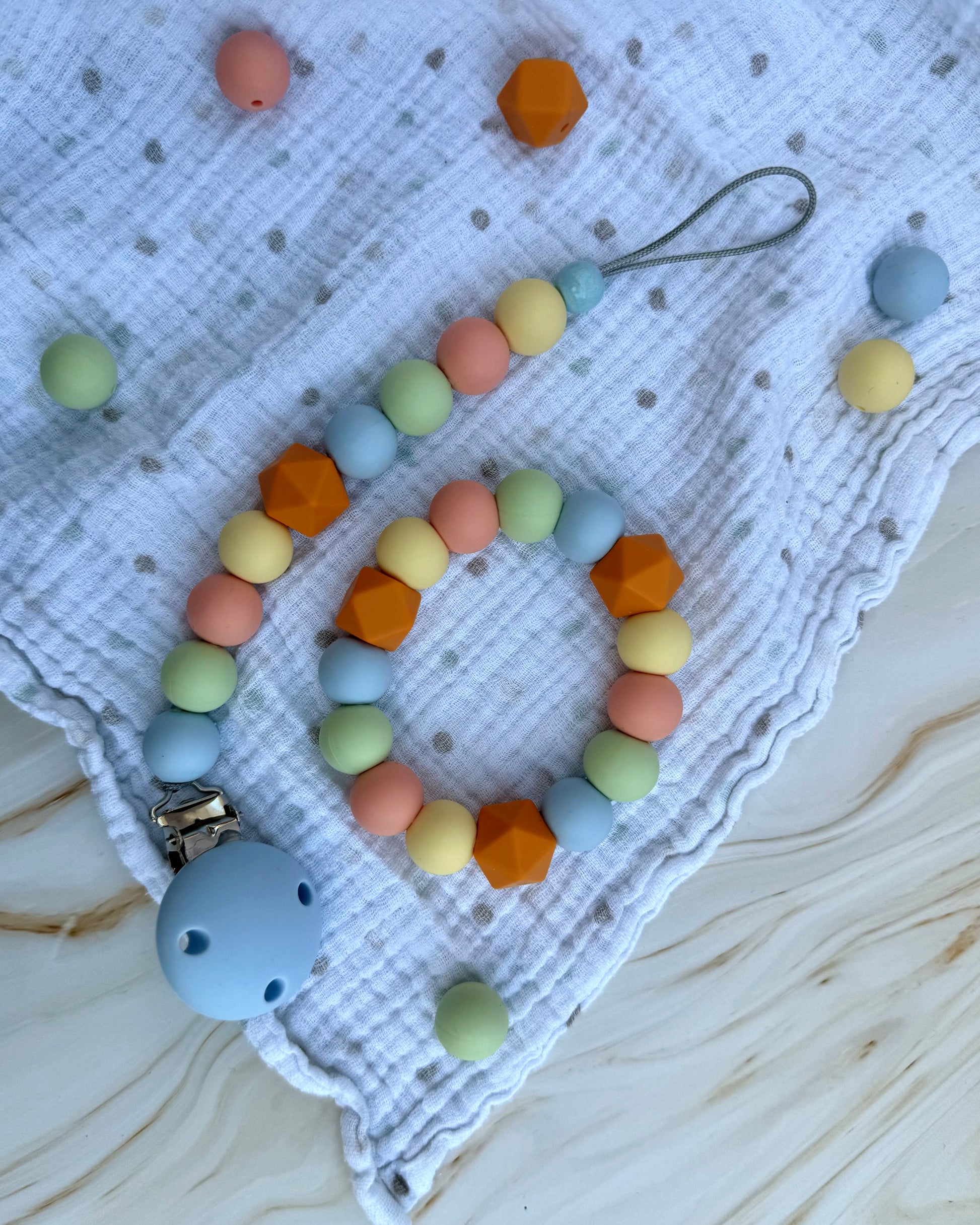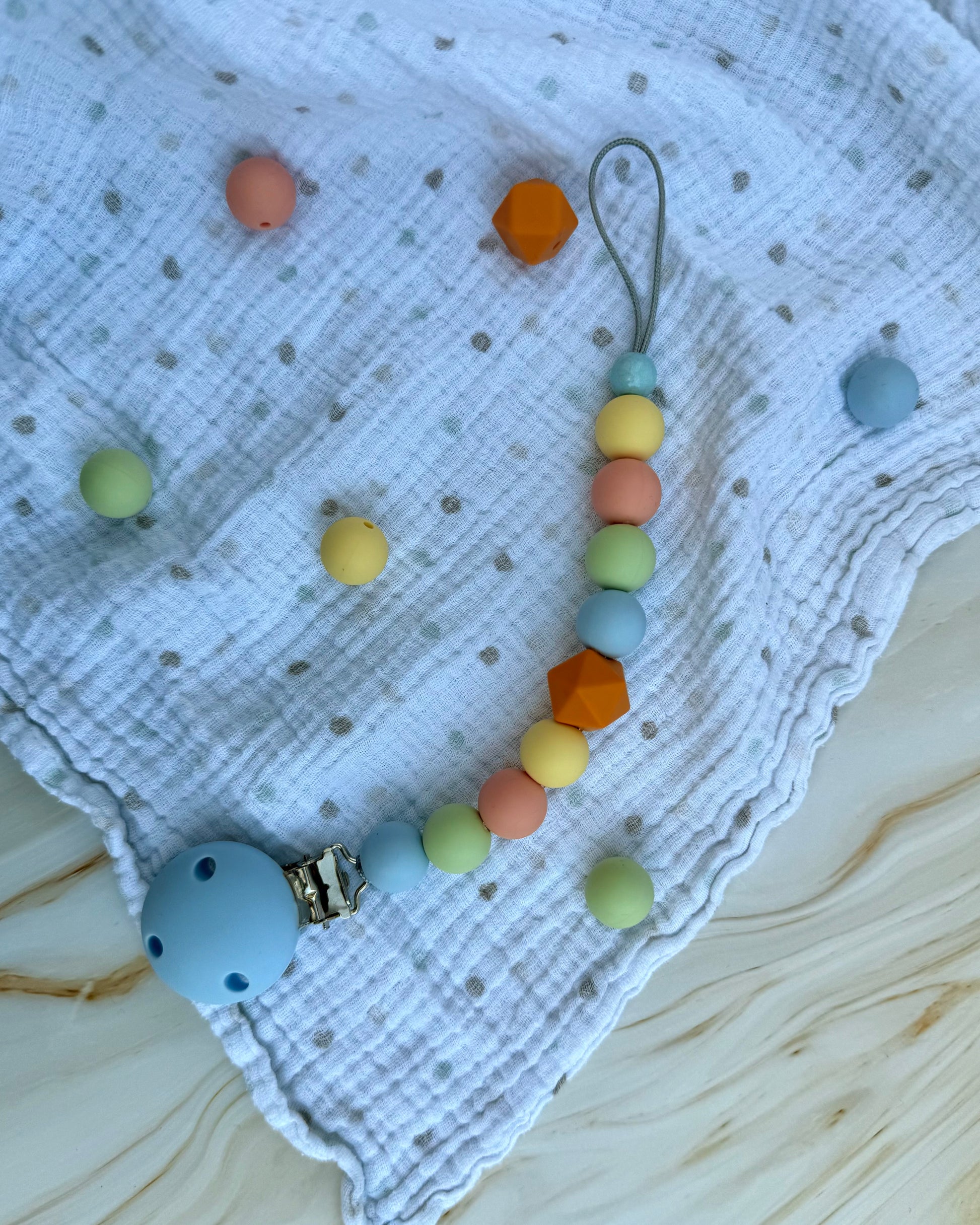 Hold smokken eller siteringen innen rekkevidde med denne håndlagde smokkelenken. Laget med BPA-frie silikonperler og slitesterk nylontråd. En trygg og praktisk løsning som hindrer at smokken faller på gulvet.