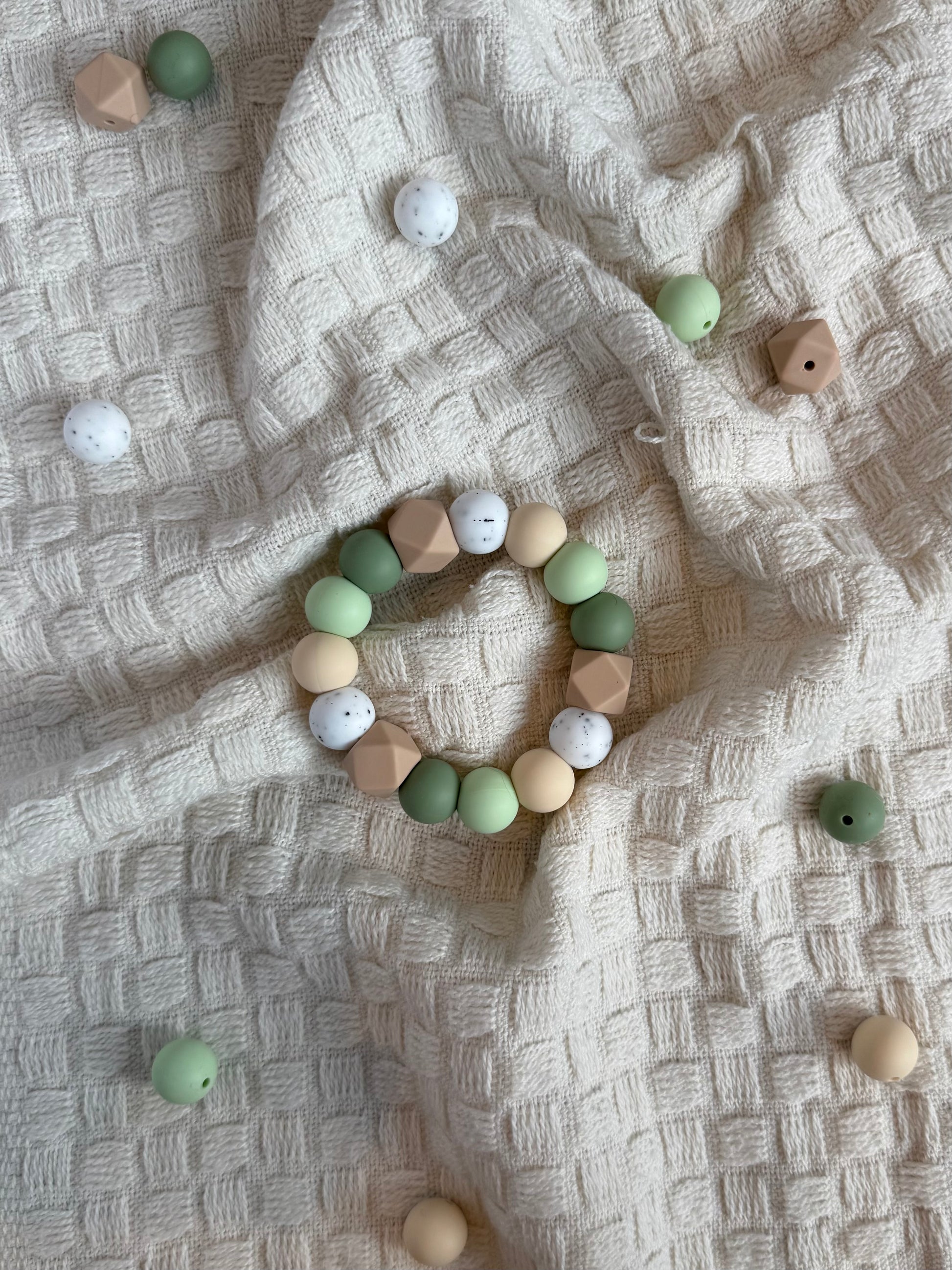 Gi babyen din en trygg og lindrende opplevelse med vår håndlagde bitering laget av BPA-frie silikonkuler og solid nylontråd. Perfekt for små babyhender, og ideell i den krevende tannfrembruddsperioden.