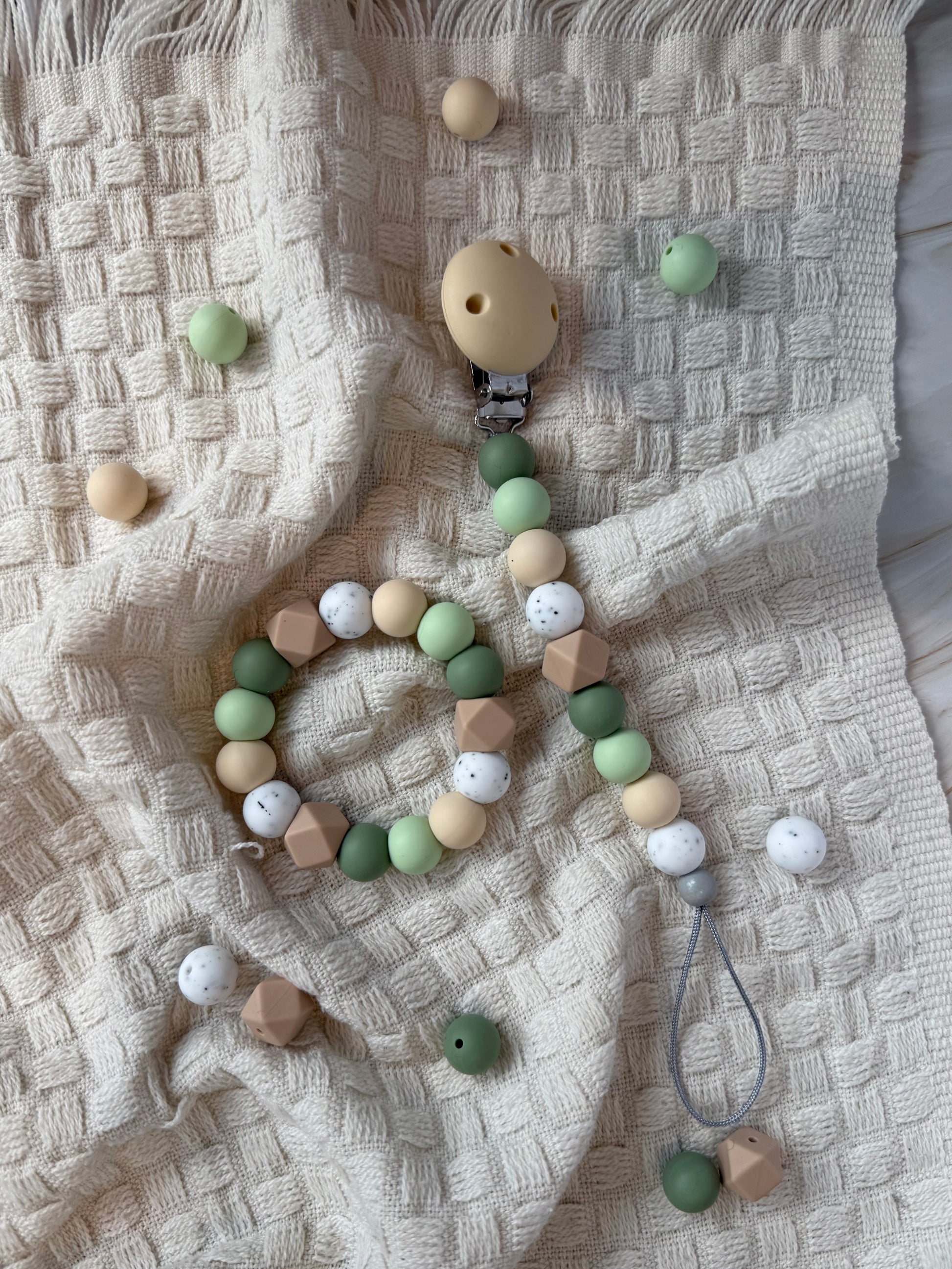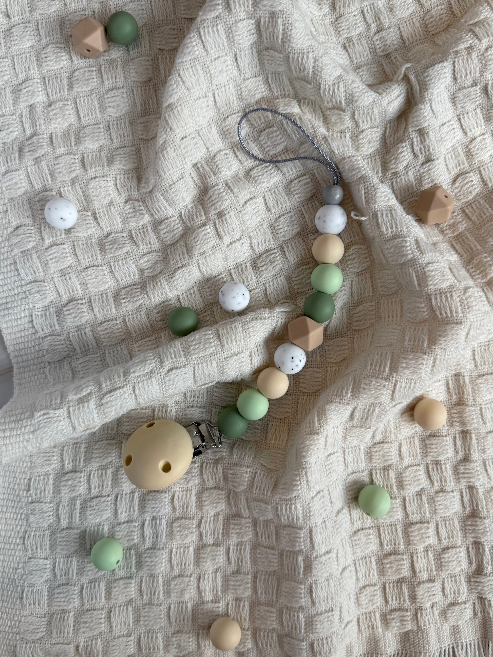 Hold smokken eller siteringen innen rekkevidde med denne håndlagde smokkelenken. Laget med BPA-frie silikonperler og slitesterk nylontråd. En trygg og praktisk løsning som hindrer at smokken faller på gulvet.